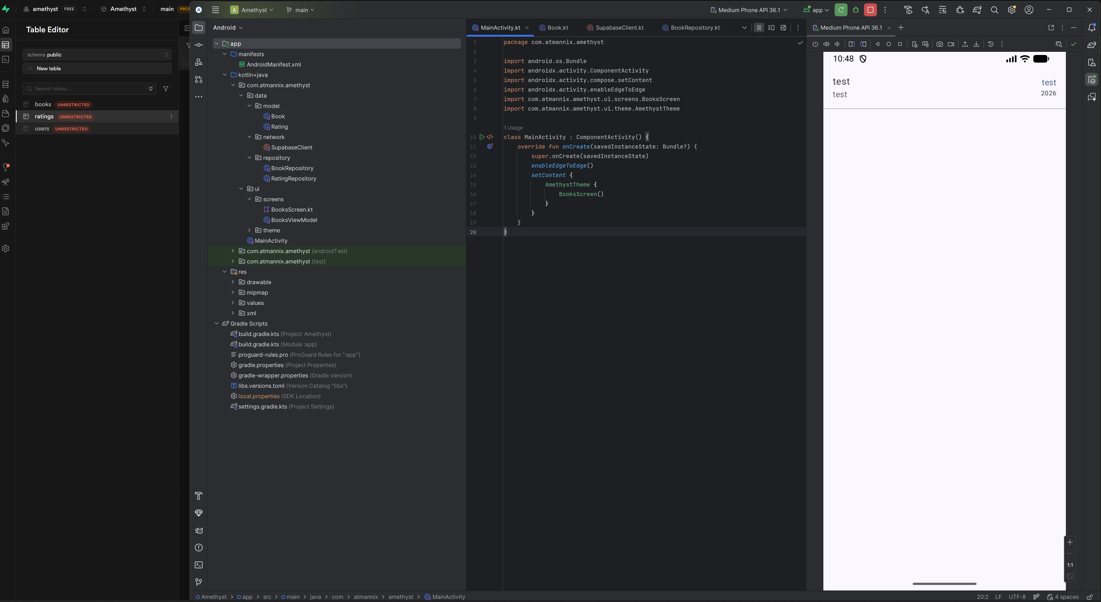 Created ratings and users tables and broke the spaghetti main activity into models, services etc.